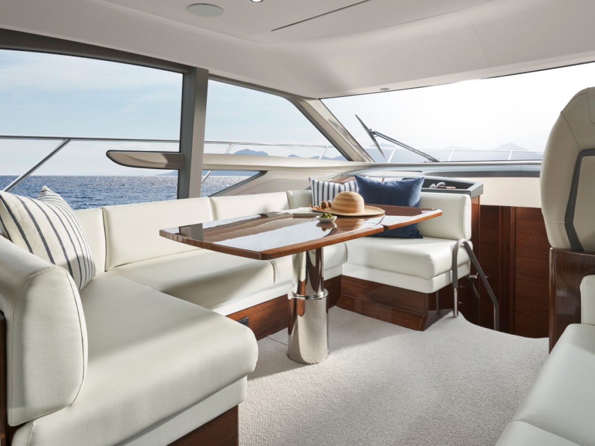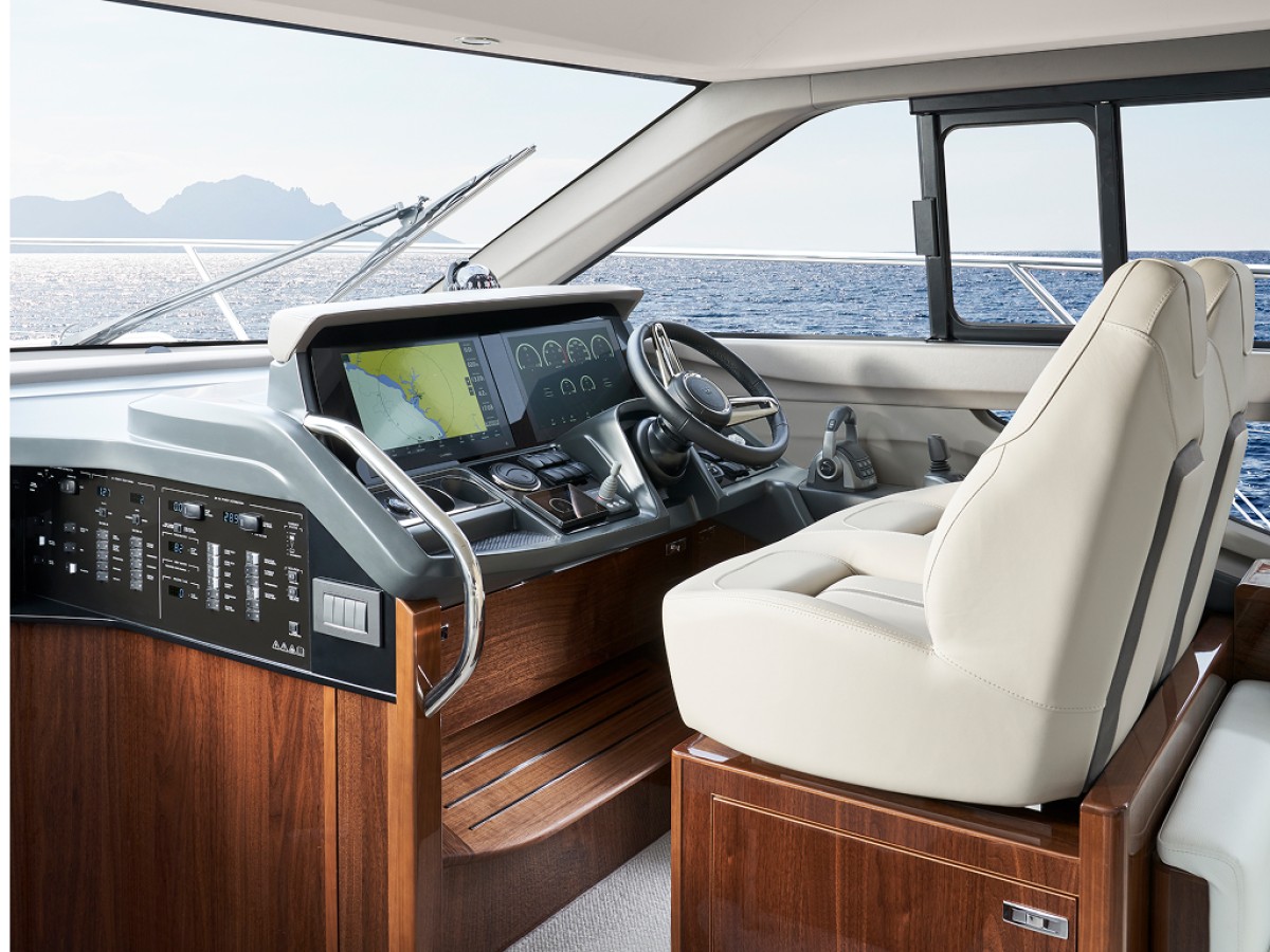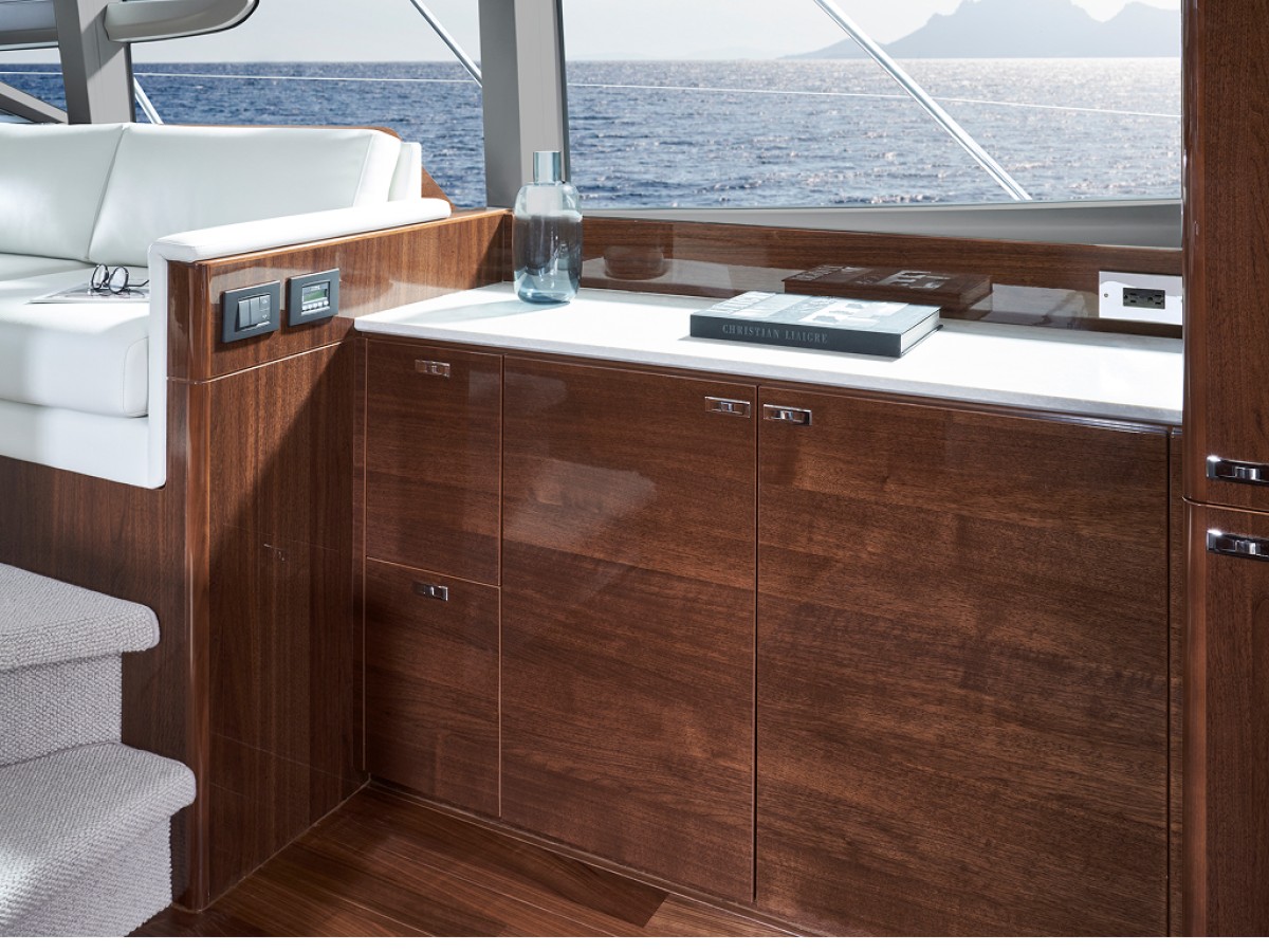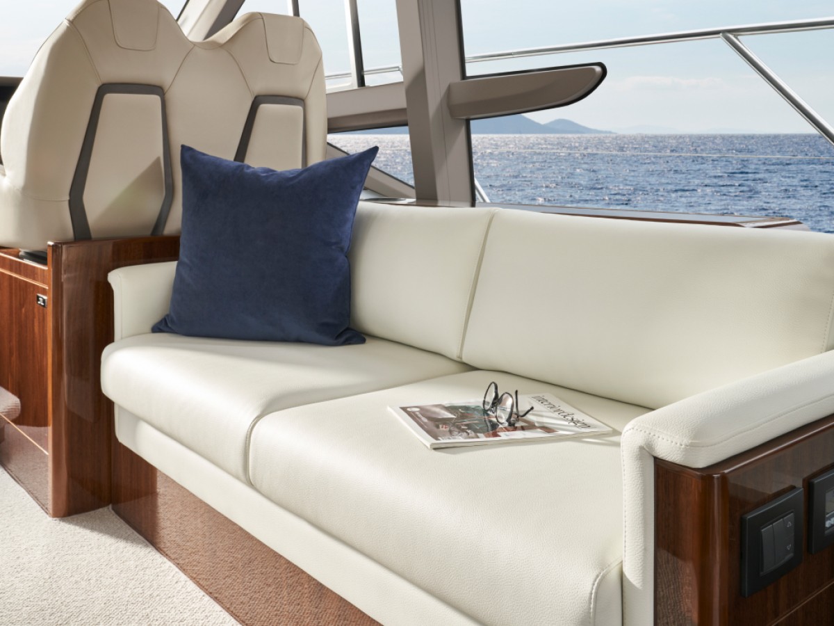 • "Cockpit and Flybridge upholstery including helm seats in Comfort Exterior IV MET/LINETEX/TANNERY Main Upholstery Colour: MET MACADAMIA"